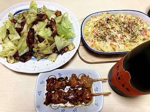 本日のメニューは、上段左から芝エビとキャベツの炒めもの、カマンベールと生ハム入りポテトマカロニグラタン、下段が焼き鳥(冷凍品を焼いたもの)、です。