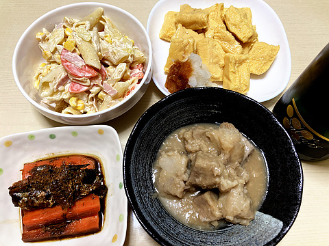 本日のメニューは、上段左からペンネのサラダ、厚焼き玉子の切り落とし(市販品)、下段左からさんま煮、八頭の煮物、です。