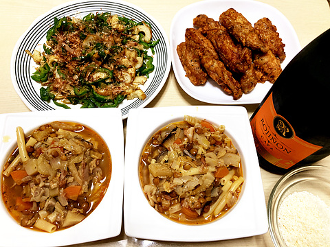 本日のメニューは、上段左からちくわとピーマンの洋風きんぴら、チキンバー(冷凍品を揚げたもの)、下段が具だくさんミネストローネ、です。