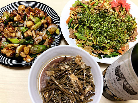 本日のメニューは、上段左からぼんじりとネギの焼き鳥風、ソース焼きそば、下段がゼンマイと油揚げの煮物、です。
