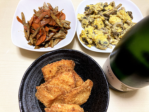 本日のメニューは、上段左からきんぴらゴボウ、きのこの玉子炒め、下段が自家製チキンカツ、です。