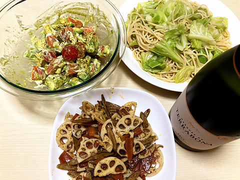 本日のメニューは、上段左からアボカドとサーモンのワサビしょう油マヨ和え、キャベツのアンチョビパスタ、下段がきんぴらレンコン、です。