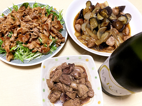 本日のメニューは、上段左から水菜の焼き肉乗っけ、ジャーマンなす、下段がレバーの味噌煮、です。