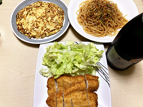 本日のメニューは、上段左からしもつかれの卵焼き、源タレのスパゲッティ、下段が自家製ササミカツ、です。