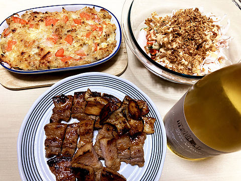 本日のメニューは、上段左からコロッケとメンチカツのグラタン風、自家製サラダチキンとにんじんときゅうりのサラダ、下段が豚肉の塩麹漬け焼き&エリンギ添え、です。