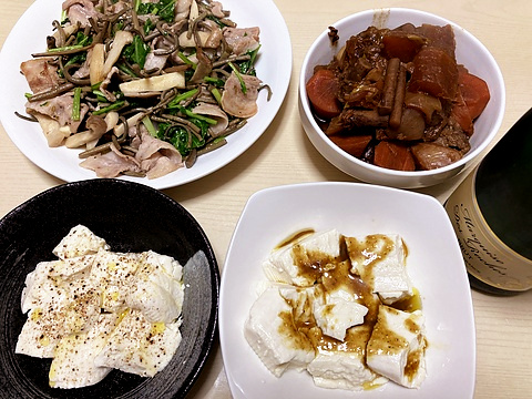 本日のメニューは、上段左から豚バラとゼンマイとエリンギの塩炒め、牛すじの煮込み、下段左から塩オリーブオイルやっこ、ワサビしょう油オリーブオイルやっこ、です。