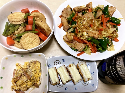 本日のメニューは、上段左からがんもどきとにんじんとインゲンの煮物、ホイコーロー、下段左から玉子もやし炒め、ちくわのチーズマヨ焼き、です。