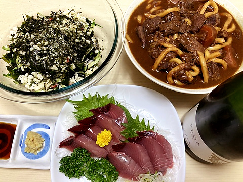 本日のメニューは、上段左からきゅうりとワカメとカニカマのサラダ、牛すじ煮込みうどん、下段がカツオの刺身、です。