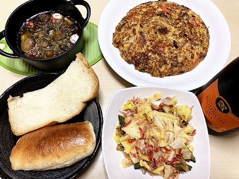 本日のメニューは、上段左からタコとマッシュルームのアヒージョ、残り物のチーズオムレツ、下段左から自家製パン2種、干しエビとジャコとキャベツの酢の物、です。