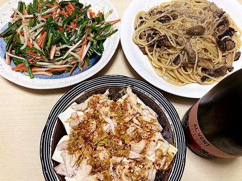 本日のメニューは、上段左からニラもやし炒め、ヒラタケのアヒージョソースパスタ、下段が自家製サラダチキンと豆腐のよだれ鶏風、です。
