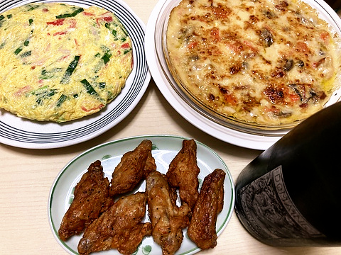 本日のメニューは、上段左からカニカマ入りニラたま、牡蠣グラタン、下段がチキンバー(冷凍品を揚げたもの)、です。