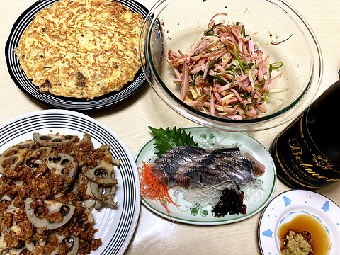 本日のメニューは、上段左からスパニッシュオムレツ、ネギチャーシュー、下段左から鶏そぼろレンコン炒め、イワシの刺身、です。