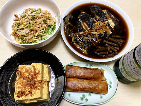 本日のメニューは、上段左から鶏皮ポン酢、黒カレイの煮付け、下段左から玉子焼きの煮浸し、春巻き(冷凍品を揚げたもの)、です。