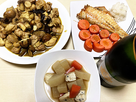 本日のメニューは、上段左から鶏ときのこのカレー炒め、赤魚のしょう油干し焼き、下段ががんもどきと根菜の煮物、です。