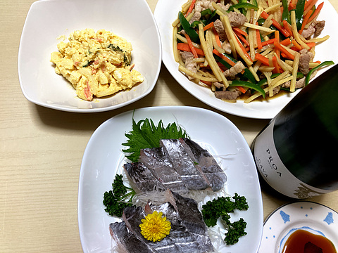 本日のメニューは、上段左から玉子マカロニサラダ(市販品)、チンジャオロースー、下段がタチウオの刺身、です。