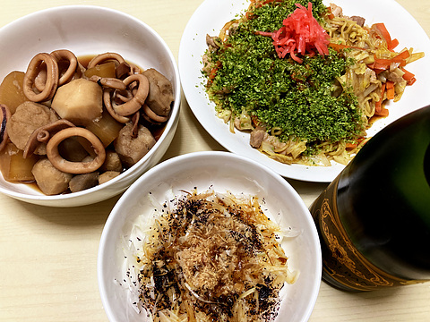 本日のメニューは、上段左からイカと里芋と大根の煮物、ソース焼きそば、下段が新玉ねぎのゆかり鰹節和え、です。