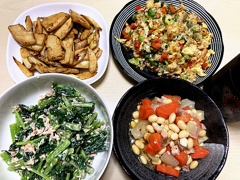 本日のメニューは、上段左からタケノコとホワイトアスパラのバターしょう油炒め、鮭レタスチャーハン、下段左から明日葉のツナ和え、洋風煮豆、です。