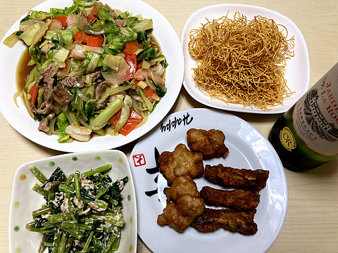 皿うどん、他 本日のメニューは、上段が皿うどんセット、下段左から明日葉のレモンツナ和え、から揚げ2種(冷凍品を揚げたもの)、です。 2枚目の写真はネギと豆腐の煮物です。 コンロの火をつけっぱなしで出し忘れていました。 あぶなーい