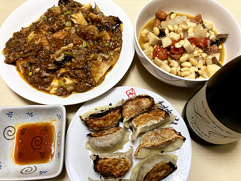 本日のメニューは、上段左から麻婆茄子厚揚げ、洋風煮豆アンチョビ味、下段が手作り餃子、です。