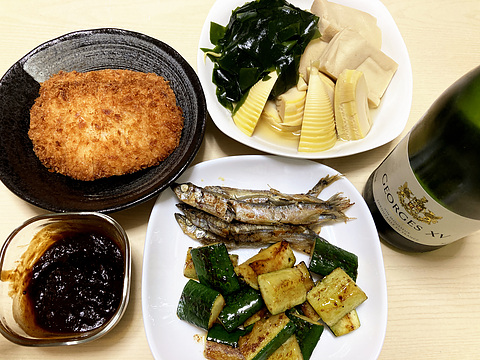 本日のメニューは、上段左から味噌カツ、若竹煮、下段がししゃもとズッキーニのソテー、です。