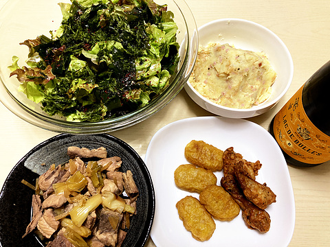 本日のメニューは、上段左からチョレギサラダ、新じゃがいものなめ茸和え、下段左からマグロのしぐれ煮、チキンナゲットとチキンバー(冷凍品を焼いたもの)、です。