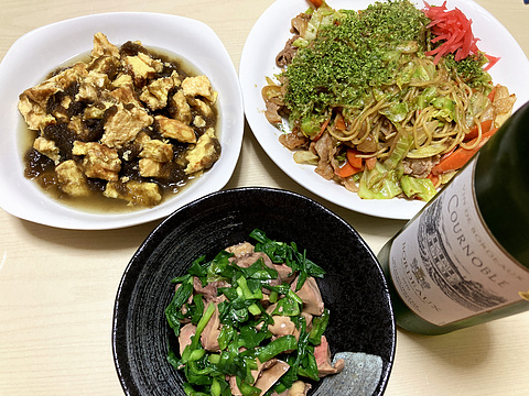 本日のメニューは、上段左から厚焼き玉子(市販品)ととろろ昆布の煮浸し、ソース焼きそば、下段がレバーとニラの中華和え、です。