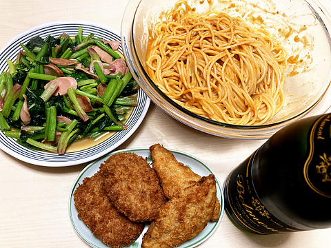 本日のメニューは、上段左から魚肉ソーセージとほうれん草のバターしょう油ソテー、蟹トマトクリームパスタ、下段がメンチカツと白身魚フライ(冷凍品を揚げたもの)、です。