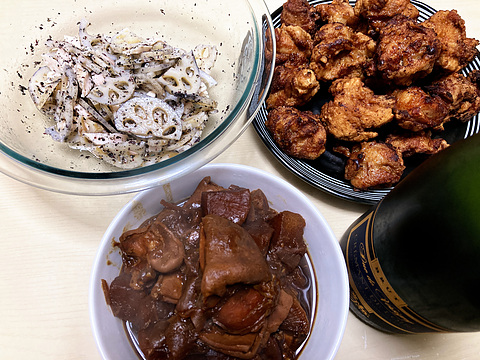 本日のメニューは、上段左から自家製鶏ハムとレンコンの梅ごまサラダ、鶏のから揚げ、下段が豚ガツのどて煮、です。