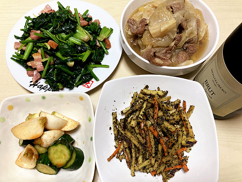 本日のメニューは、上段左からベーコンとほうれん草のバターしょう油ソテー、国産牛すじとキャベツの塩煮込み、下段左からカブときゅうりのキムチ漬け、さつまいものきんぴら、です。