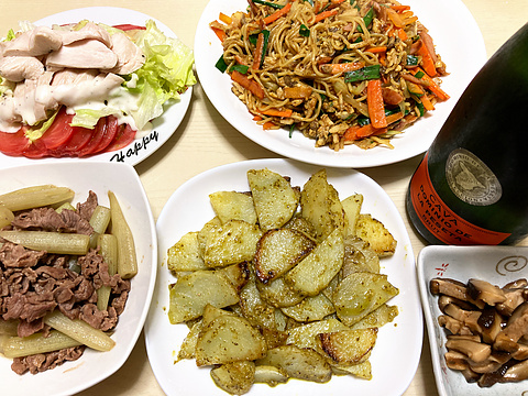 本日のメニューは、上段左から自家製サラダチキンとレタスとトマトのサラダ、変わりソース焼きそば、下段左から牛肉とフキの照り煮、じゃがいものジェノベーゼ、しいたけの甘酢佃煮、です。