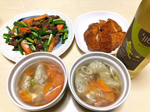 本日のメニューは、上段左からレバニラ炒め、自家製チキンカツ、下段が自家製餃子のスープ、です。