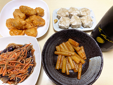 本日のメニューは、上段左から鶏のから揚げ(市販品)、シュウマイ(市販品)、下段左からナスの南蛮漬け、フキのキムチ炒め、です。