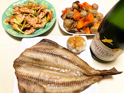 本日のメニューは、上段左から豚キムチ、鶏団子とにんじんの酢豚風、下段がシマホッケの干物、です。