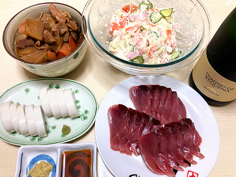 本日のメニューは、上段左からモツ煮込み、ポテトサラダ、下段左から板わさ、鰹の刺身、です。
