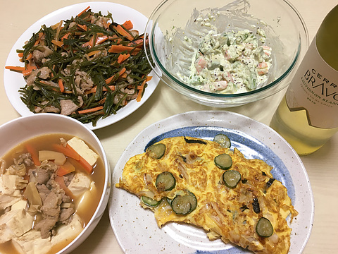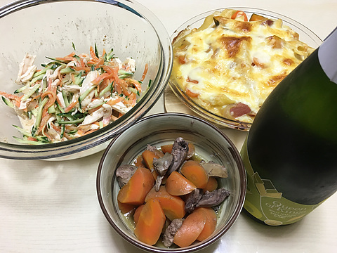 本日のメニューは、上段左から茹で塩豚の胡麻ソースがけ、エビとしめじのクリームパスタ、下段がゼンマイのナムル、です。