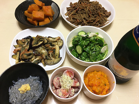 本日のメニューは、上段左からかぼちゃの煮付け、牛肉ときんぴらの時雨煮、中段左からちくわとナスの塩炒め、きゅうりとカブの浅漬け、下段左から生しらす、トマトの粒マスタードサラダ、かぼちゃの筋子和え、です。