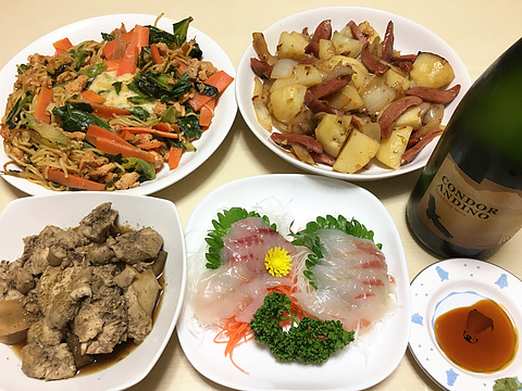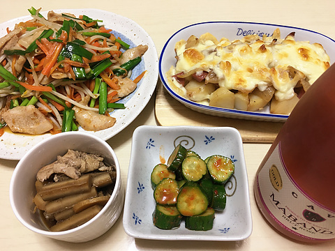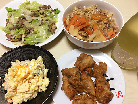 本日のメニューは、上段左からひき肉とレンコンとキャベツのごまドレッシング炒め、豚肉とにんじんとタケノコと湯葉の煮物、下段左から玉子ポテマカサラダ(既製品)、鶏のから揚げ(既製品を揚げたもの)、です。
