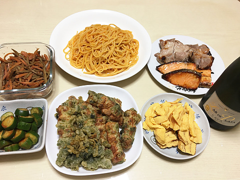 本日のメニューは、上段左からきんぴらごぼう、カニトマトクリームパスタ、豚肉の塩麹漬けと鮭の酒粕みそ漬け焼き、下段左からきゅうりのキムチ漬け、ちくわの磯辺揚げとゼッポリーニ、玉子焼きの切り落とし(既製品)、です。