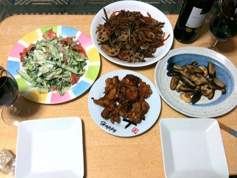 洋風きんぴら、唐揚げ、焼ききのこ、サラダ
