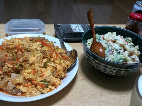 いつもマカロニサラダはどんぶりに山盛りになっています。