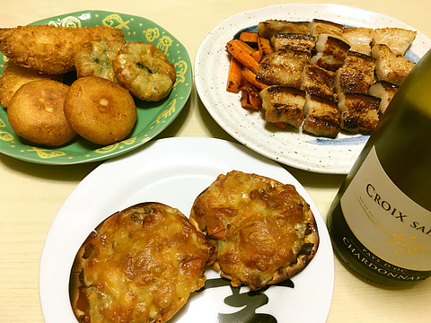 本日のメニューは、上段左から揚げ物各種、豚肉の塩麹漬け焼き、下段が鶏レバーのミニピザ、です。