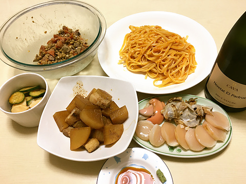 本日のメニューは、上段左から鶏レバーとレンズ豆のサラダ、カニトマトクリームパスタ、下段左からきゅうりとカブのピリ辛漬け、豚肉と大根の味噌煮、ホタテの刺身、です。