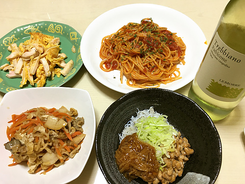 本日のメニューは、上段左から鶏ハムの玉子炒め、アラビアータパスタ、下段左から切り干し大根の煮物、納豆のしらすおろしなめ茸和え、です。