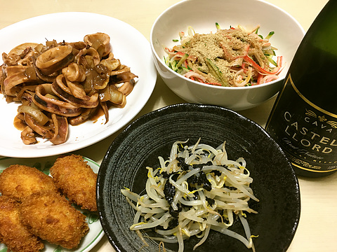 本日のメニューは、上段左からイカのゴロ焼き、カニカマときゅうりともやしのサラダ、下段左からカキフライ(既製品を揚げたもの)、もやしの中華海苔和え、です。