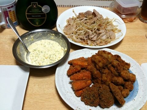 フライとタルタルソース、もやしと肉の炒め物